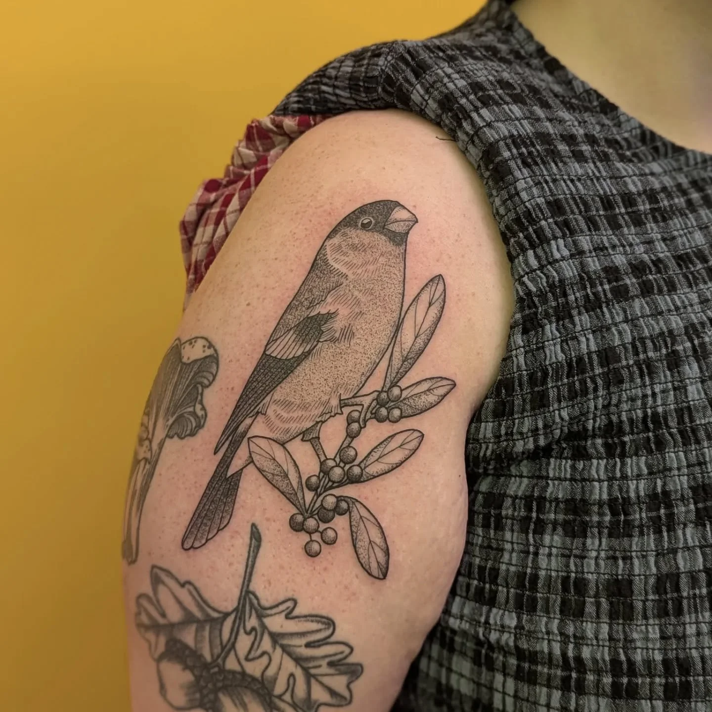 View fullsize A bullfinch and rosemary beetles next to some acorns and  chanterelle mushrooms we tattooed a couple of years ago! 💛